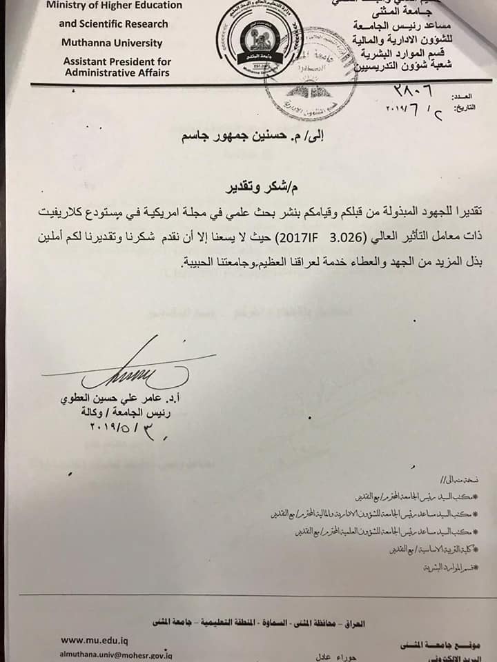 يونيو 9, 2019ثمن الاستاذ الدكتور عامر العطوي رئيس جامعة المثنى جهود الباحث المدرس حسنين جمهور وذلك لنشره بحث علمي في مجلة امريكية ، ضمن مستودع ( سكوبس ) و ( كلاريفيت ) كما ثمن جهود كل الباحثين والاساتذة في الجامعة من اجل الارتقاء بمستوى الرصانة العلمية للجامعة ، عن طريق نشر بحوثهم العلمية في مجلات عالمية رصينة .