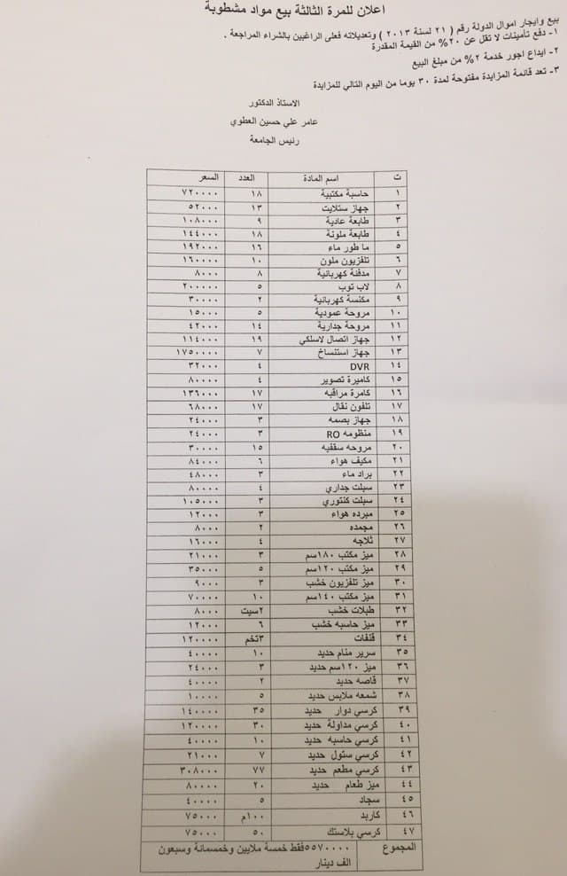 يونيو 21, 2021تعلن جامعة المثنى للمرة الثالثة عن بيع المواد المشطوبة في مخازن رئاسة جامعة المثنى والمدرجة ضمن القائمة في ادناه ، فعلى الراعبين بالشراء مراجعة الجامعة .